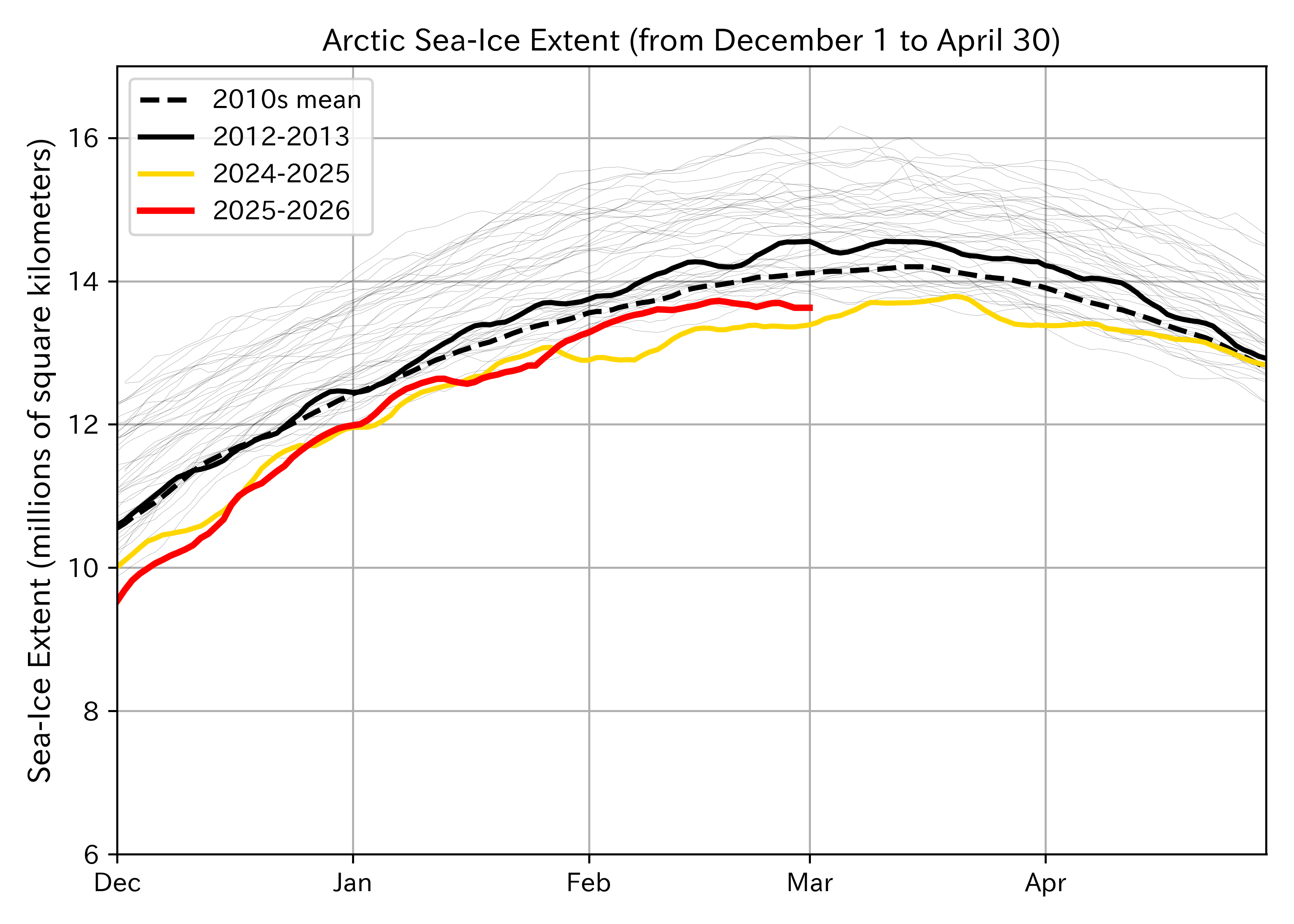 Figure 1: Arctic sea-ice extent from December 1, 2025, to March 1, 2026 (red), compared with the previous 47 years (from December 1 to April 30). The 2012–2013 period is shown in black, the 2024–2025 period in yellow, and other years as thin lines. The 2010s (2011–2019) mean is indicated by the black dashed line. Here, sea-ice extent was calculated using a five-day average.