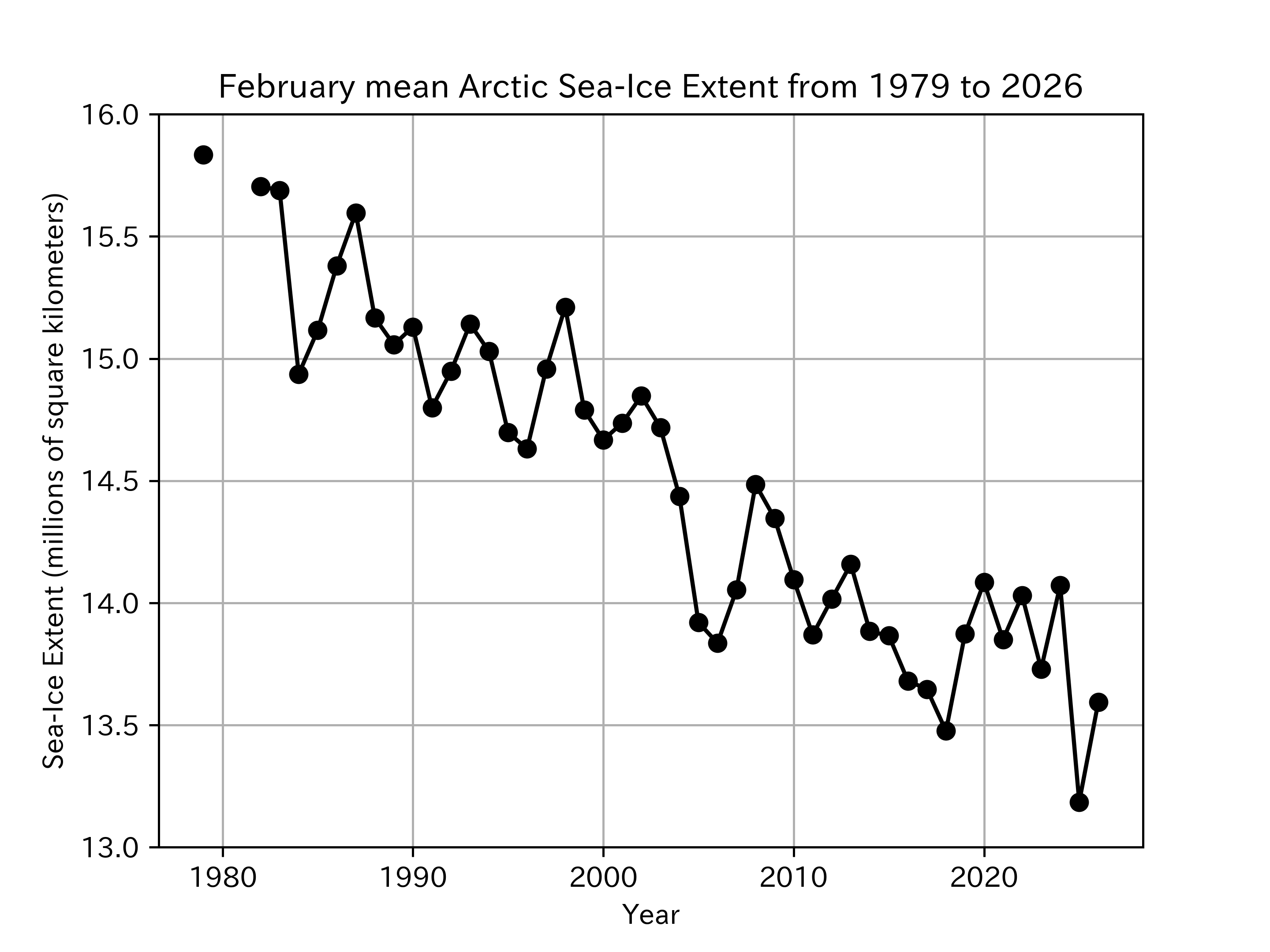 Figure 2: Interannual variability in February mean Arctic sea-ice extent from 1979 to 2026. Years with insufficient data to calculate monthly means (1980–1981) were treated as missing sea-ice extent.