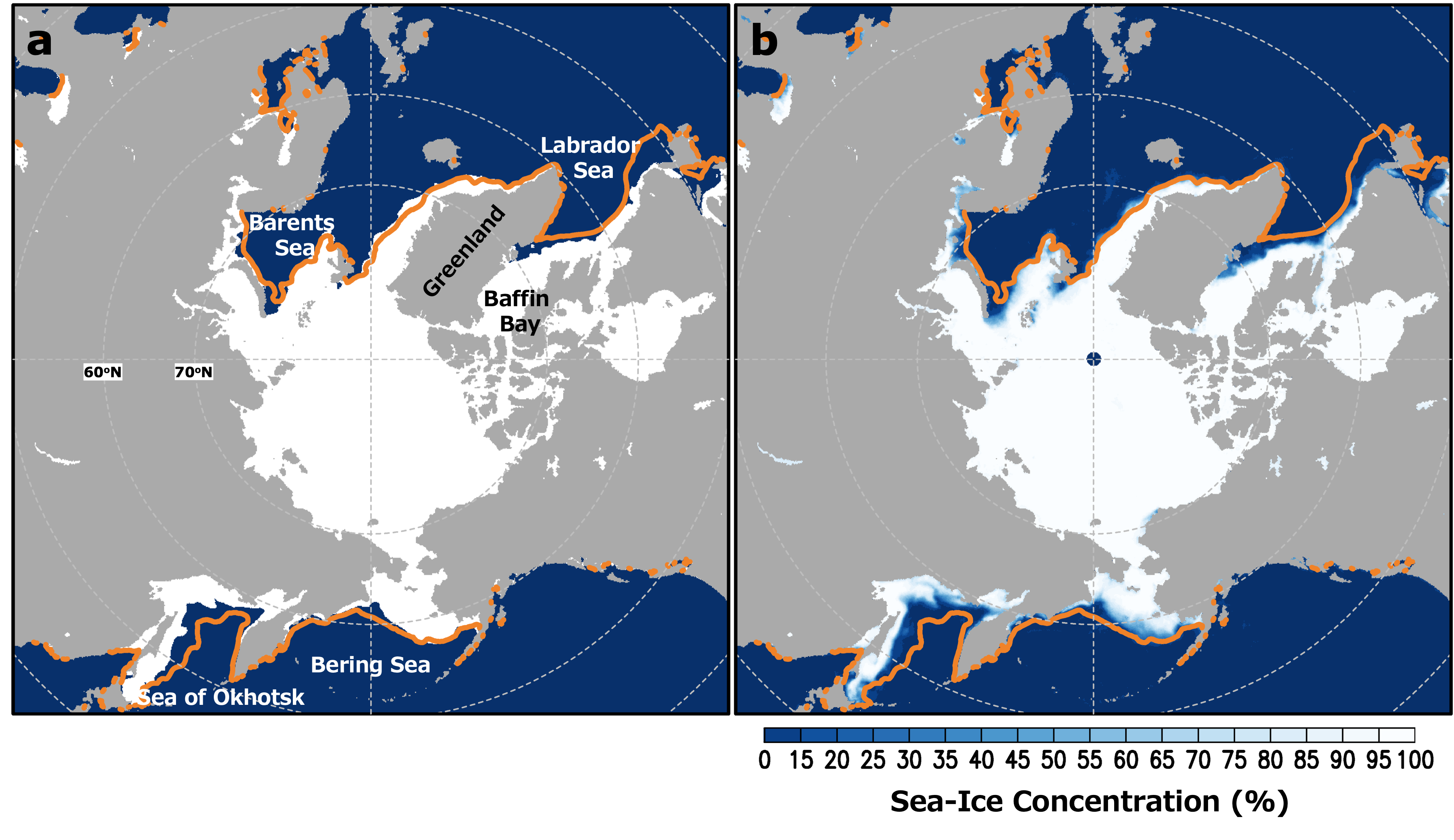Figure 3: Arctic sea-ice extent (a) and concentration (b) averaged in February 2026. The orange line indicates the sea-ice edge (area with at least 15% sea-ice concentration) averaged over the 2010s.