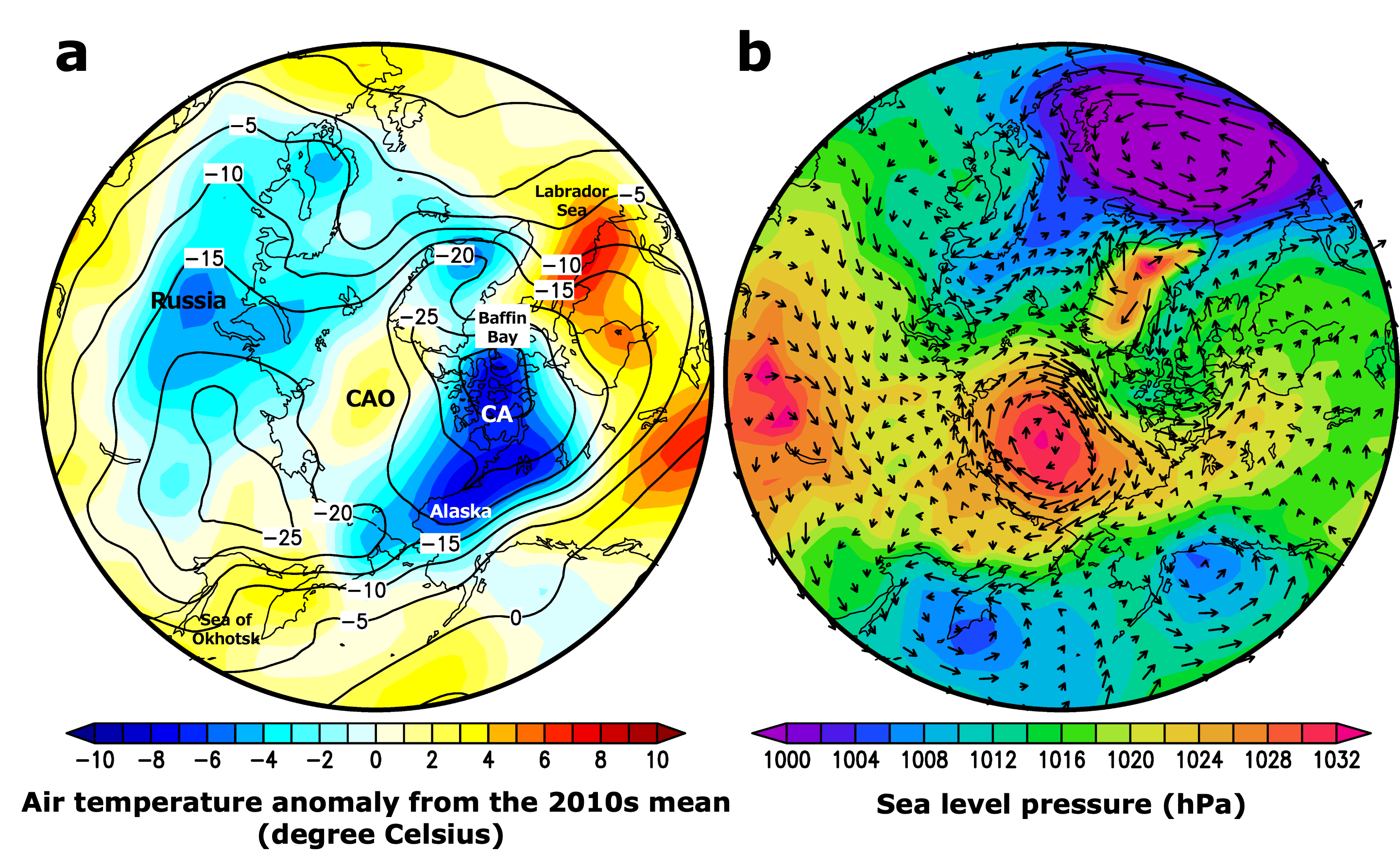 Figure 4: (a) Air temperature anomalies (°C) at the 925 hPa relative to the 2010s mean for February 2026. Yellow-to-red and light blue-to-dark blue shading indicate warmer and colder than the 2010s mean, respectively. CAO: Central Arctic Ocean; CA: Canadian Archipelago. (b) Sea level pressure (hPa) and wind vectors (m s–1) at the 925 hPa for February 2026. Data from NCEP-NCAR Reanalysis 1 (note 2) were used in this figure.