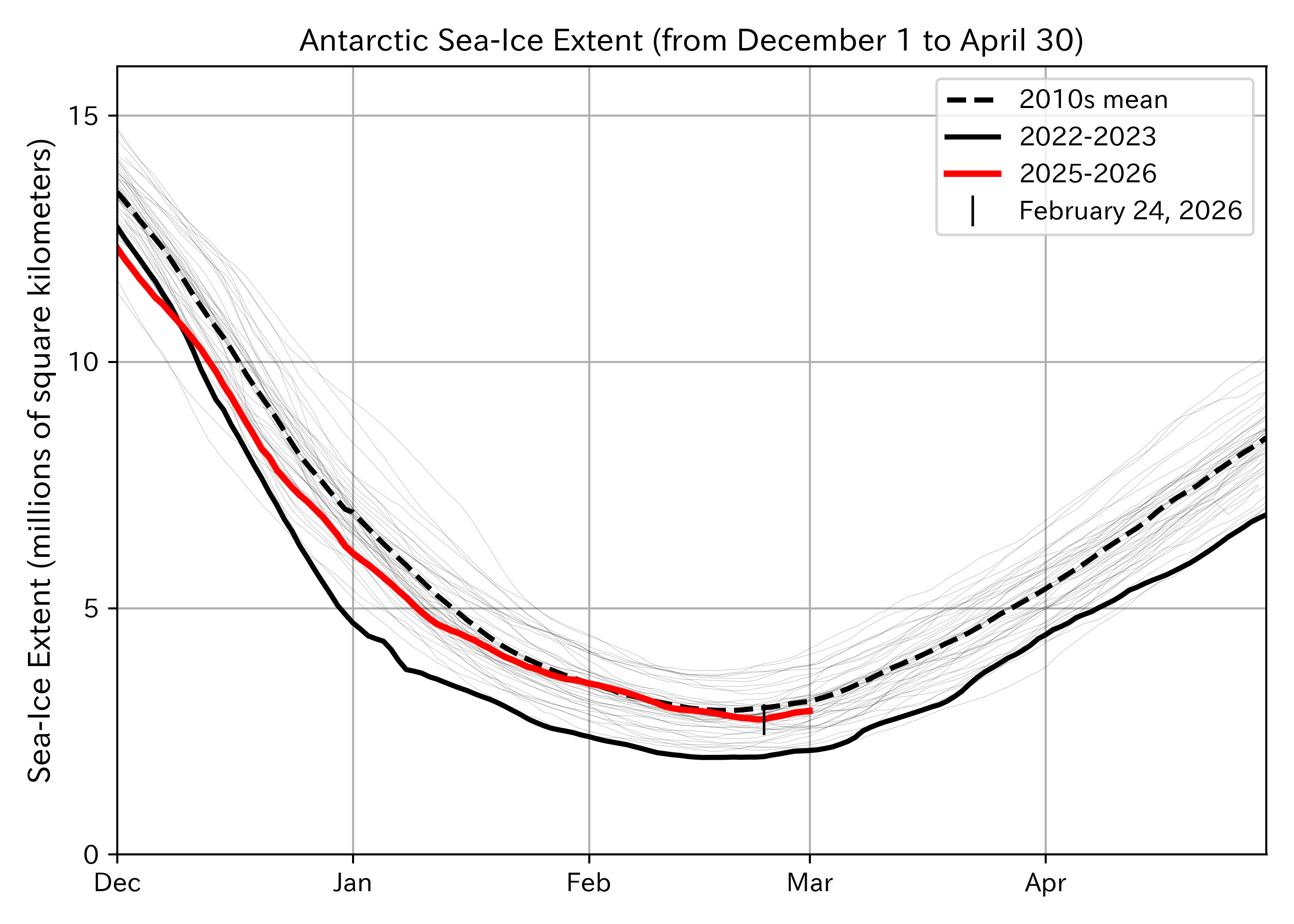 Figure 5: Antarctic sea-ice extent from December 1, 2025, to March 1, 2026 (red), compared with the previous 47 years (from December 1 to April 30). The 2022–2023 period is shown in black, and other years are shown as thin lines. The 2010s (2011–2019) mean is indicated by the black dashed line. Here, sea-ice extent was calculated using a five-day average.