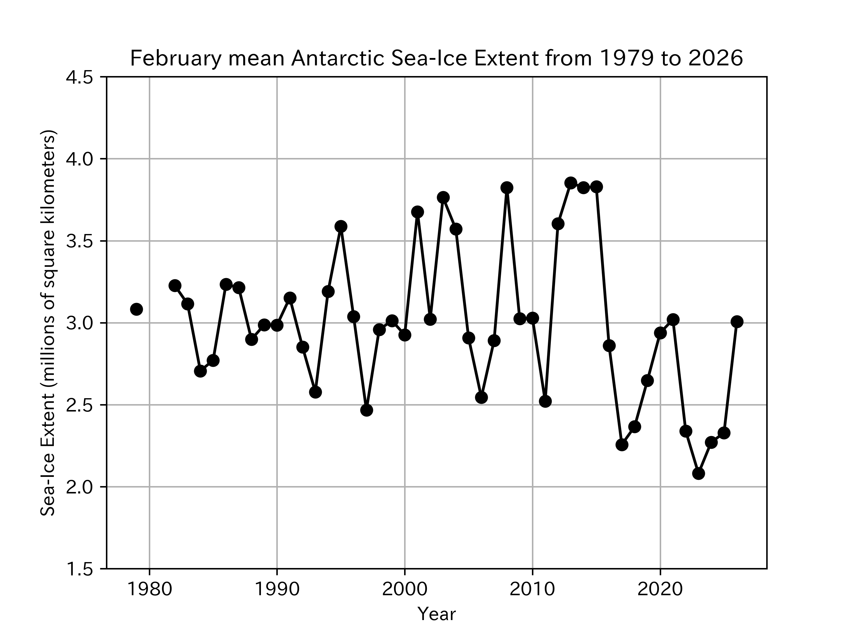 Figure 6: Interannual variability in February mean Antarctic sea-ice extent from 1979 to 2026. Years with insufficient data to calculate monthly means (1980–1981) were treated as missing sea-ice extent.