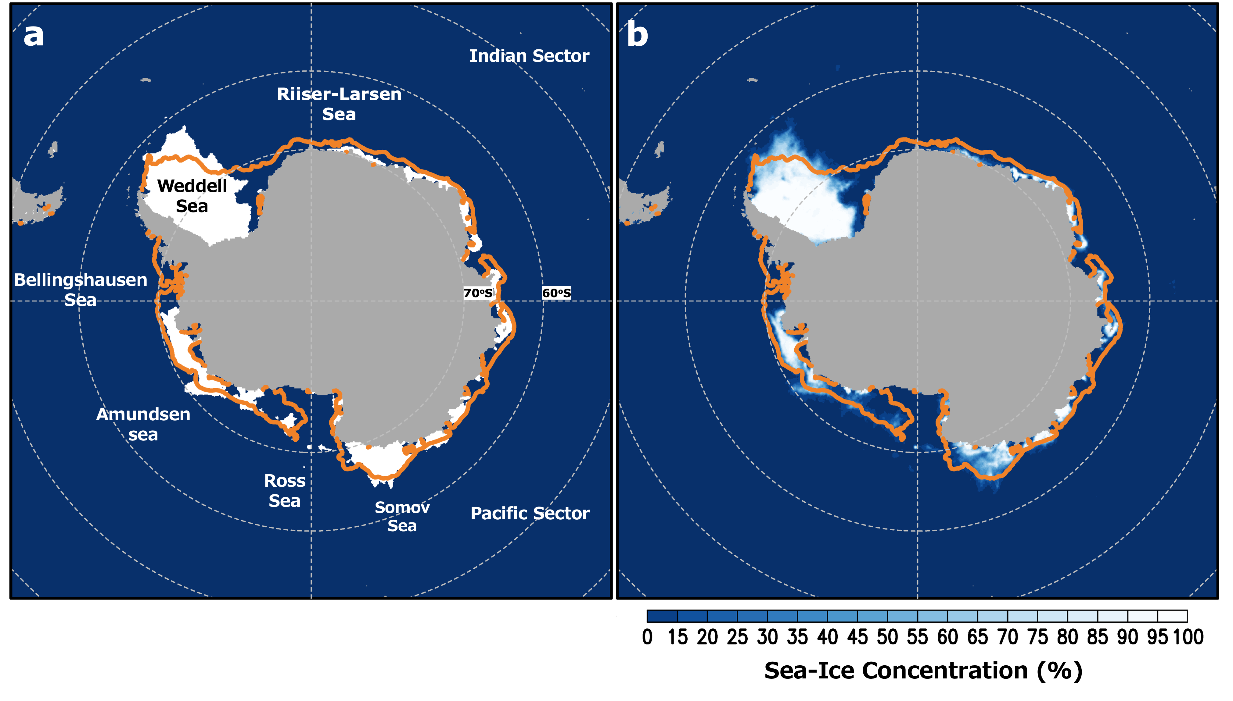 Figure 7: Antarctic sea-ice extent (a) and concentration (b) averaged in February 2026. The orange line indicates the sea-ice edge (area with at least 15% sea-ice concentration) averaged over the 2010s.
